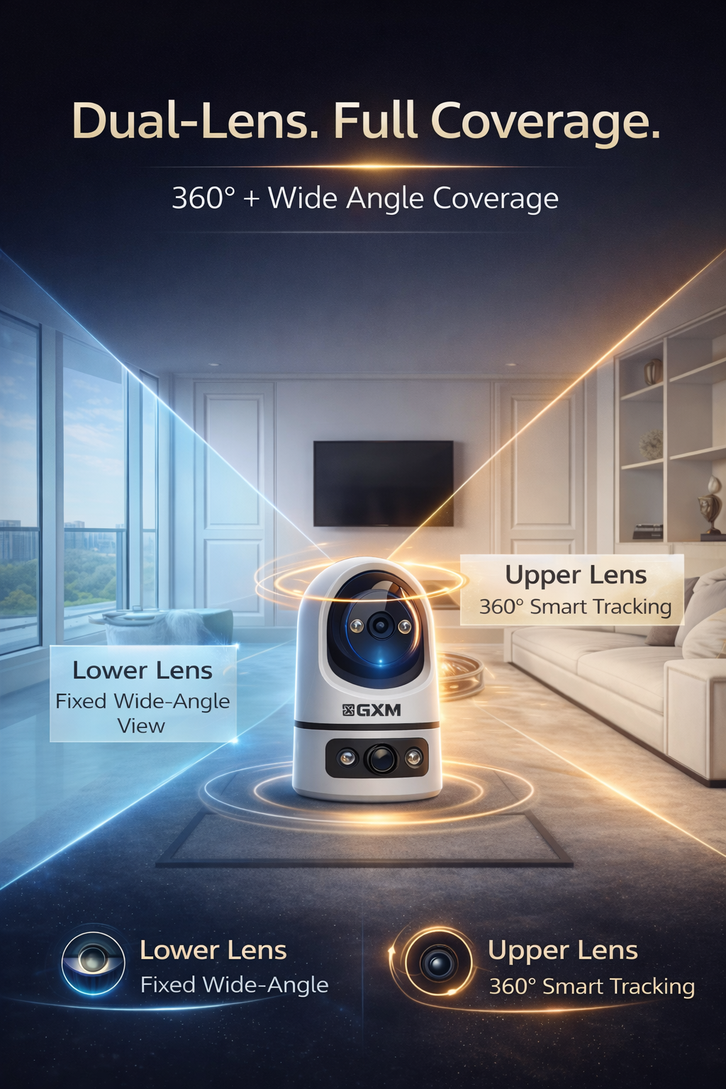• Upper Lens: 360° Pan & AI Auto Tracking