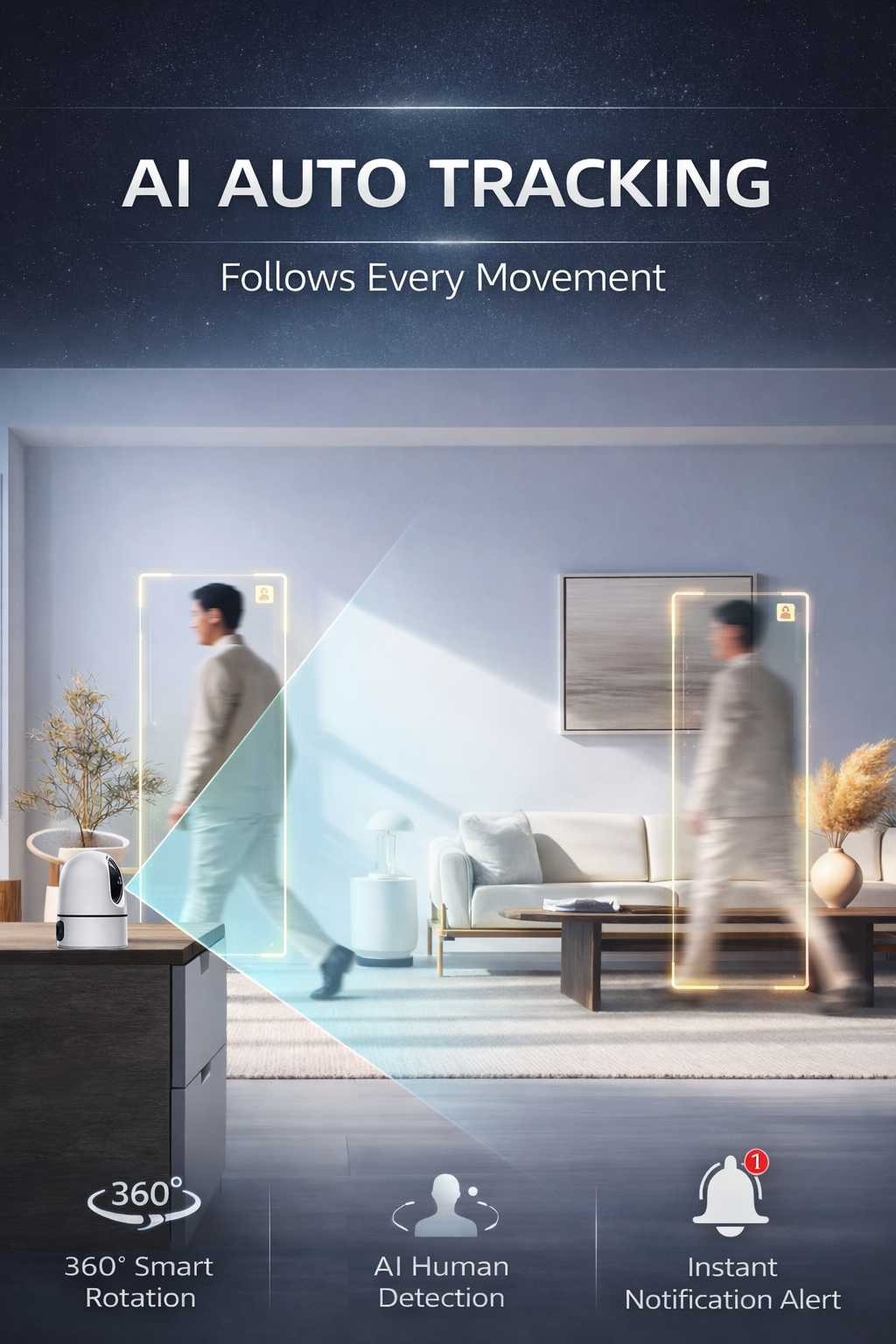 Upper lens supports 360° auto tracking while lower lens provides fixed wide-angle view — one camera does the work of two.