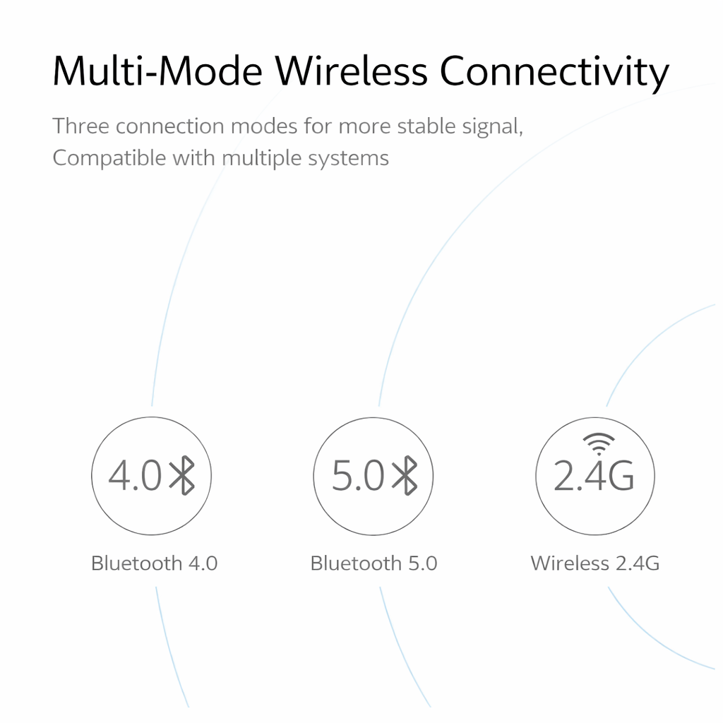 • 🔗 Multi-Mode Connectivity – Bluetooth 5.0 / Bluetooth 4.0 / 2.4GHz Wireless