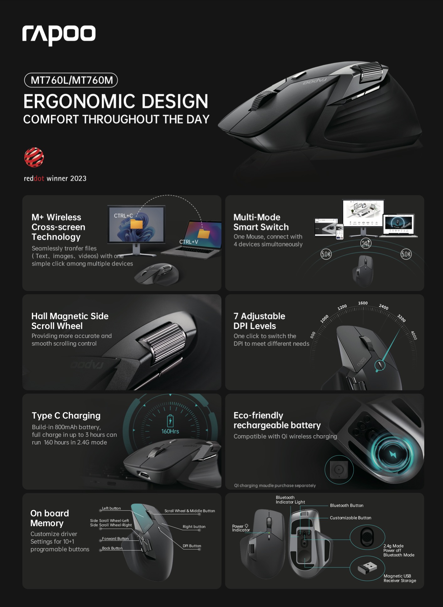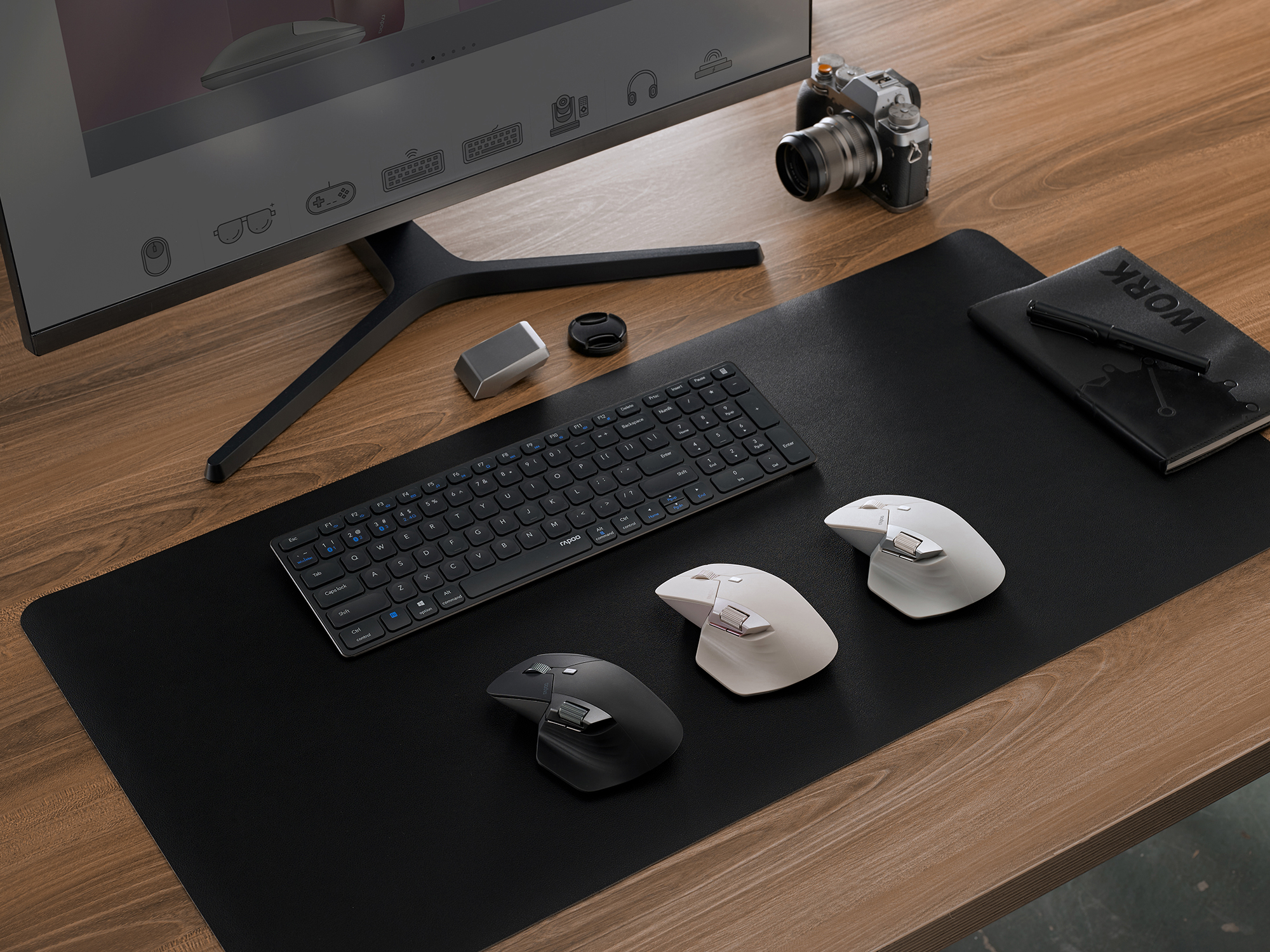 The RAPOO MT760 Series combines M+ cross-screen control, multi-device switching, and ergonomic comfort in one premium mouse. Seamlessly move between devices, transfer files, and work smarter—whether at home, office, or on the go.