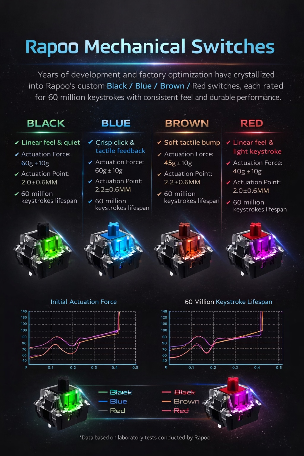 Choose from Blue / Brown / Red switches for precise, responsive keystrokes with up to 60 million keystrokes lifespan.