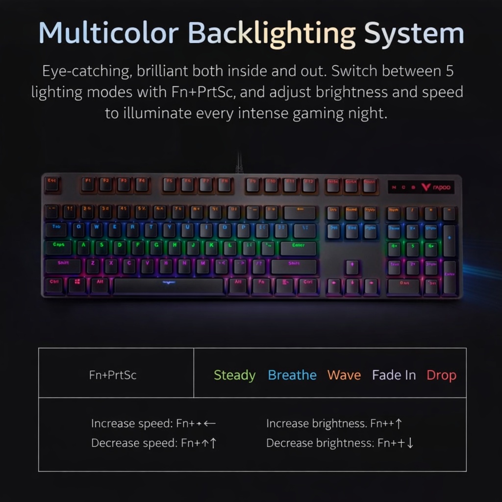 5 dynamic lighting modes with adjustable brightness and speed for immersive gaming atmosphere.